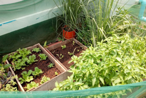 Right Picture: Garden scale crop farming that locals have started in temporary shelters.
